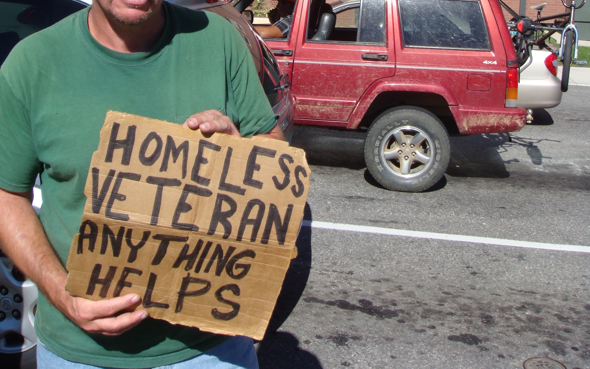 “Nurse Jo!” he yelled as he hopped up on the sidewalk beside me, grinning. On the street corner near us was a middle-aged white man holding a cardboard sign, with large hand-written words: “Homeless Veteran. Anything Helps.” I hadn’t noticed him before. He turned toward us. I saw it was James,* another former Street Center clinic patient of mine. He and Bruce were longtime friends, both were Viet Nam vets, and both were River Rats.